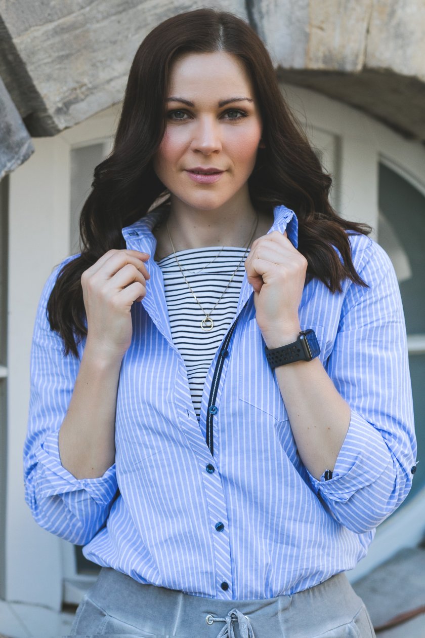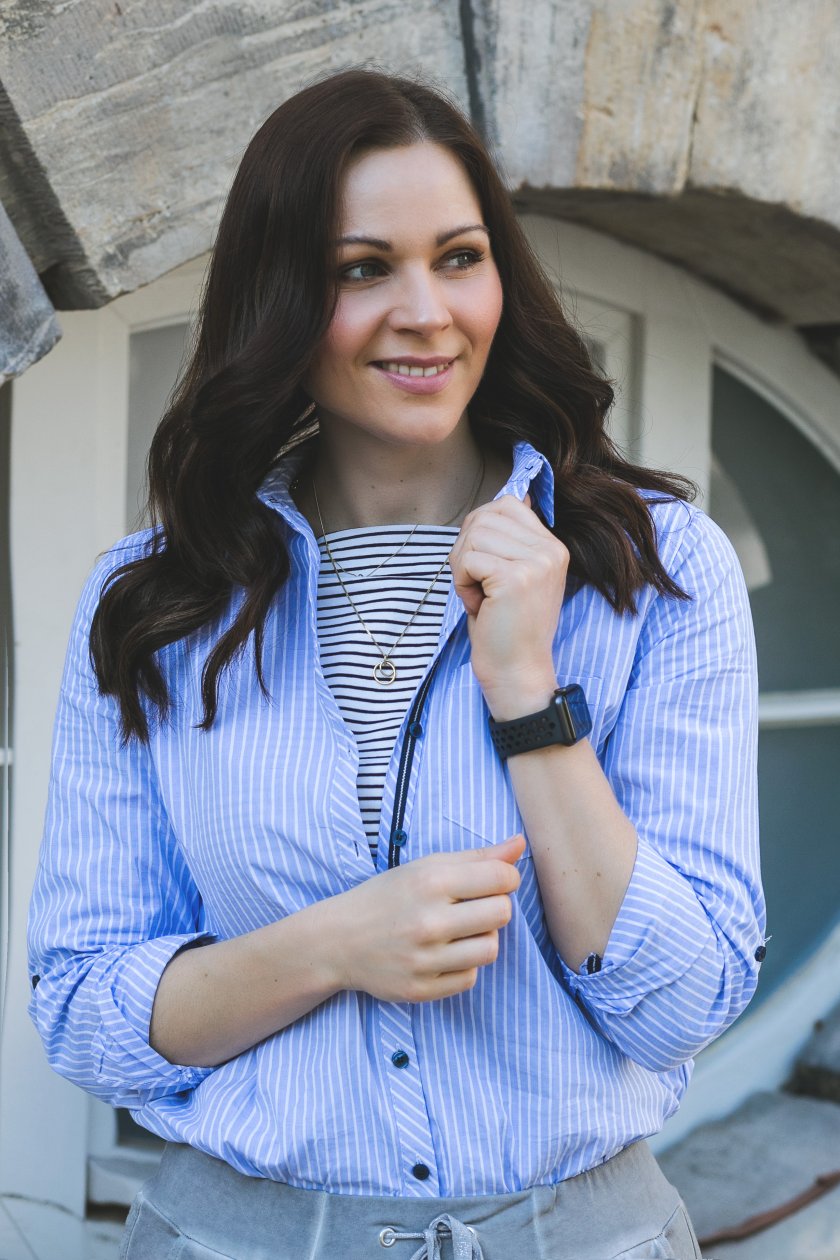 Der Look ist ja mal so richtig cool und lässig! Ich liebe die Sweatpants und diese tolle Streífenbluse ist superschick! Die beiden miteinander kombinierten Streifenteile bilden echt ein tolles Detail.