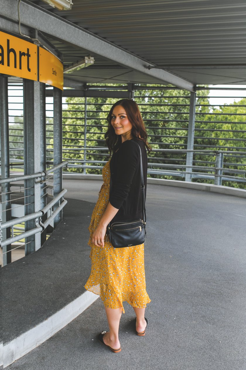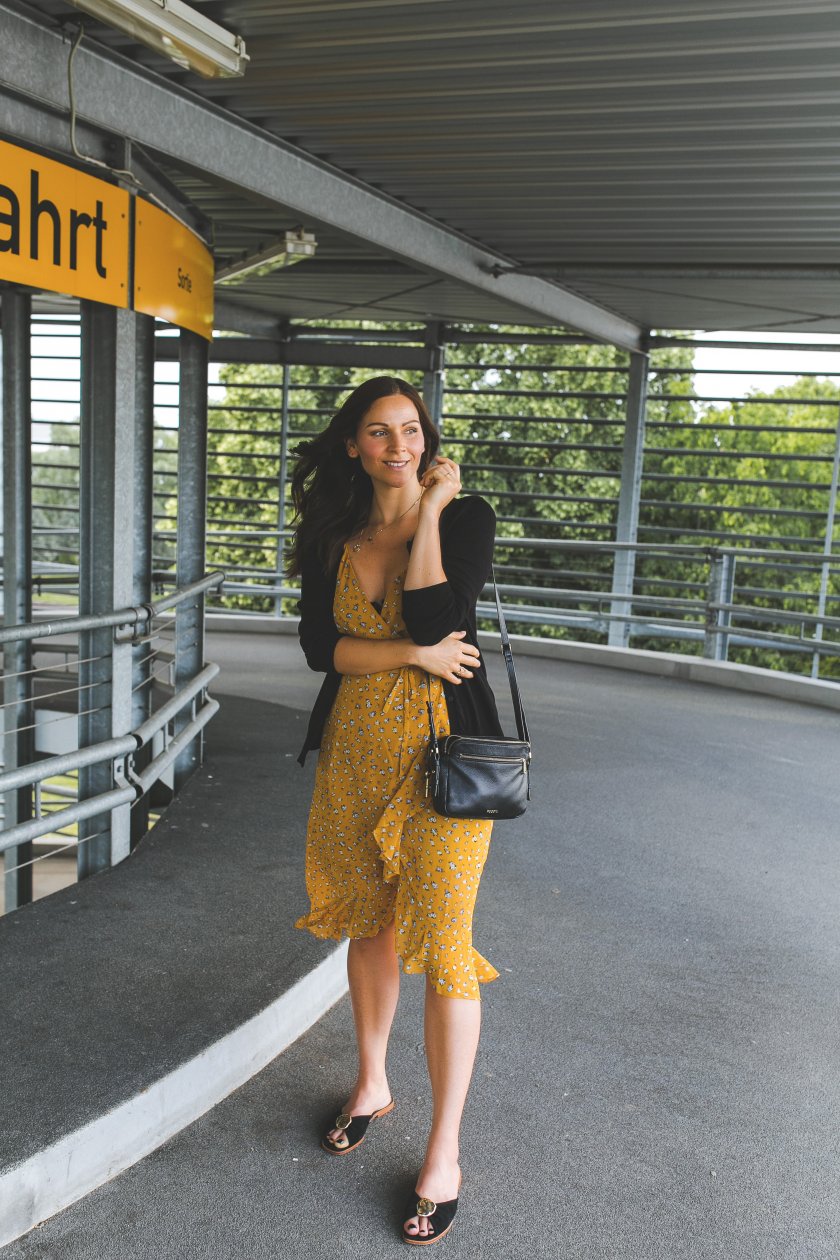 Das Kernstück meines heutigen Outfits ist definitiv das gelb-geblümte Sommerkleid. Das Kleid in gemütlicher Midilänge zieht alle Blicke auf sich und ist zudem im trendigen Wrap-Dress-Stil geschnitten. Besonders gut an diesem Kleid gefällt mir das Material. Es liegt sehr leicht auf der Haut und bringt einem an heißen Sommertragen auch nicht ins Schwitzen. Neben dem Material habe ich mich auch in die Details des Kleides verliebt. Die unauffälligen Rüschen an der Vorderseite des Kleides lassen es verspielt wirken und zugleich elegante.