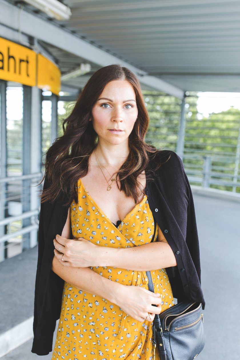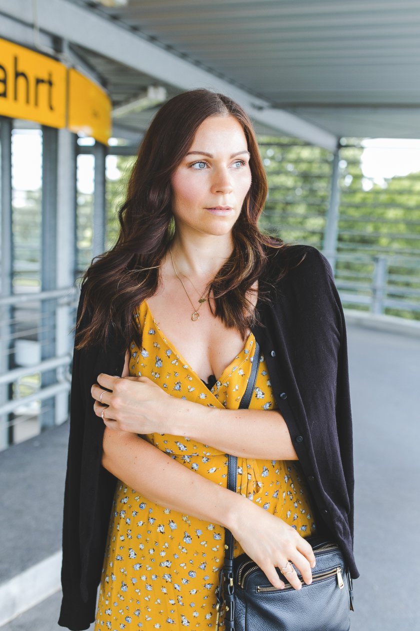 Kombiniert habe ich das gelbe Midikleid mit dezenten Accessoires in Schwarz. Zum einen mit meinen Flattered Sandalen, die ich bereits im letzten Sommer lieben gelernt habe und meiner Fossil Pieper Tasche, ebenfalls eine alte Bekannte hier auf dem Blog. Neu hinzugekommen ist der schwarze Cardigan. Der an lauen Sommernächsten den Look auf gekonnte Weise abrundet und mich warm hält.