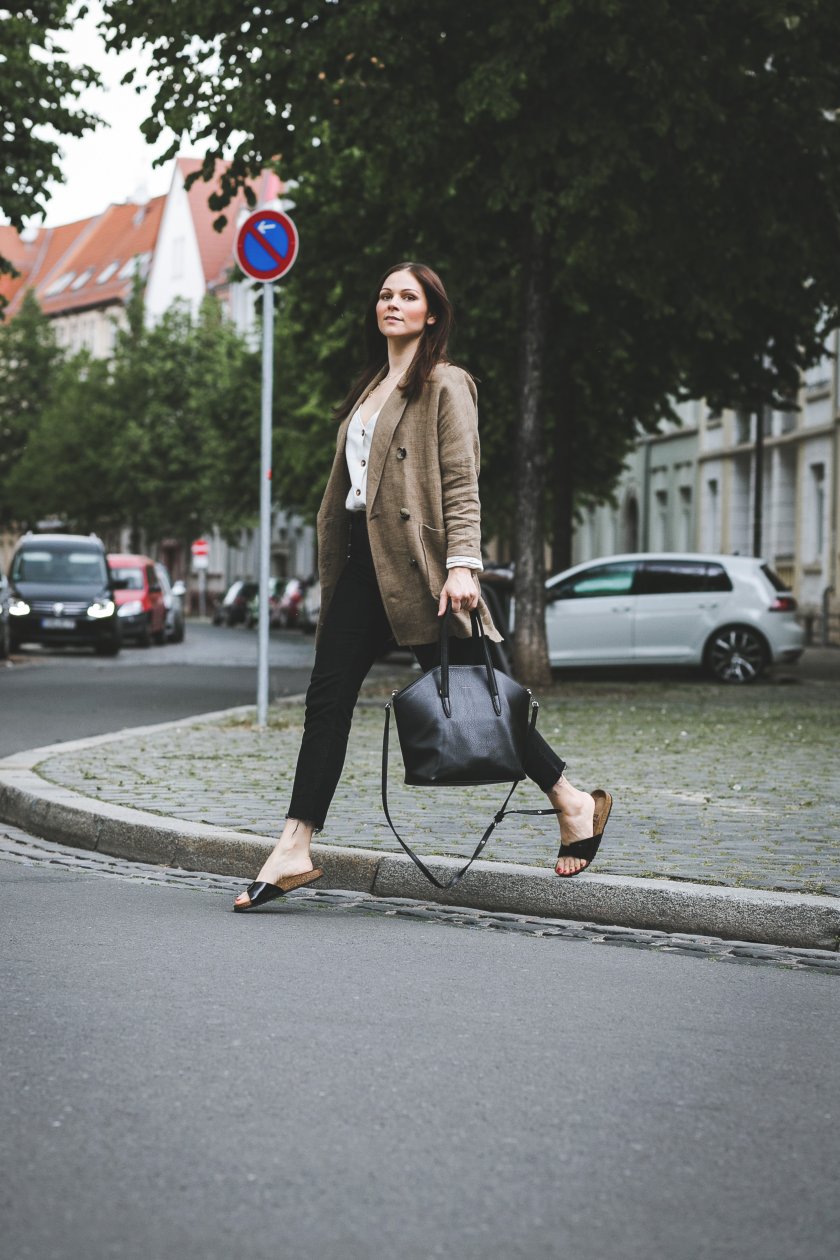 Mein Frühlingsoutfit mit Leinen Blazer, Topshop Orson Jeans und Birkenstock Madrid Sandalen