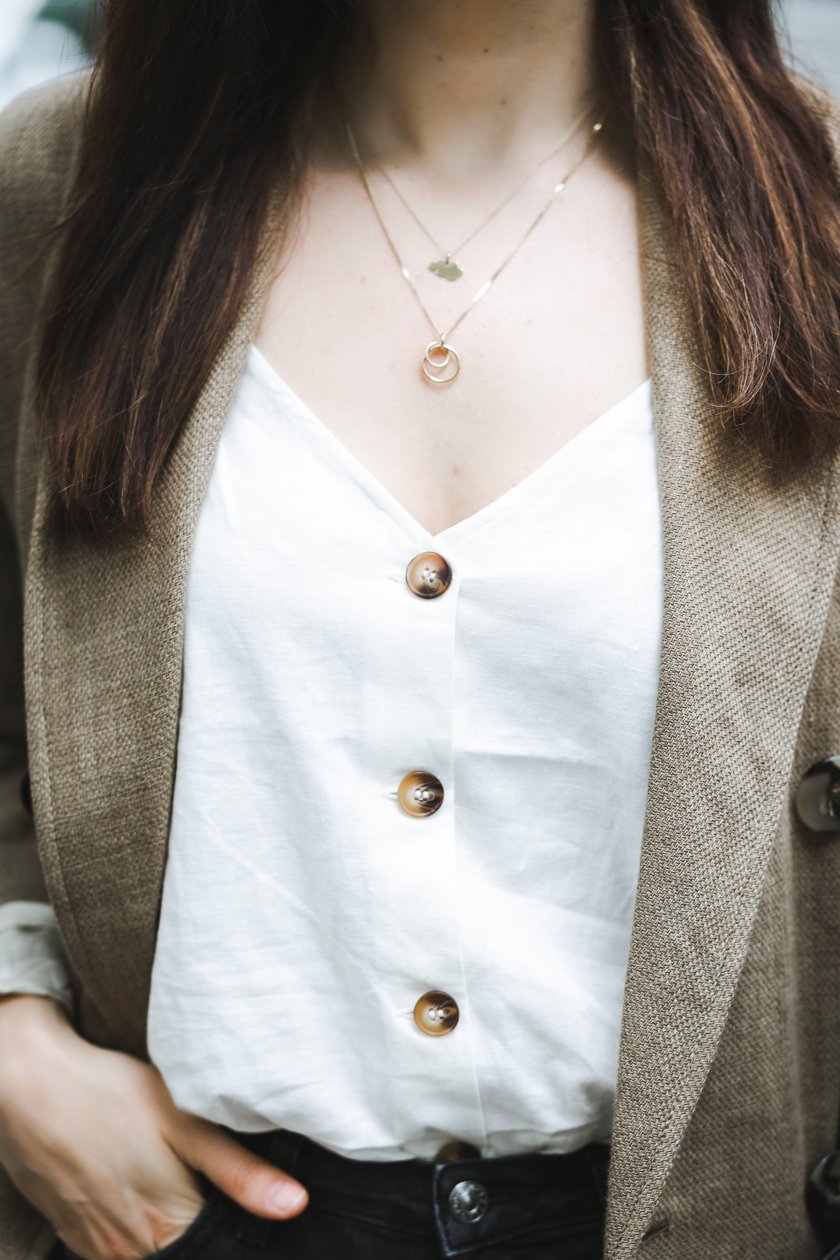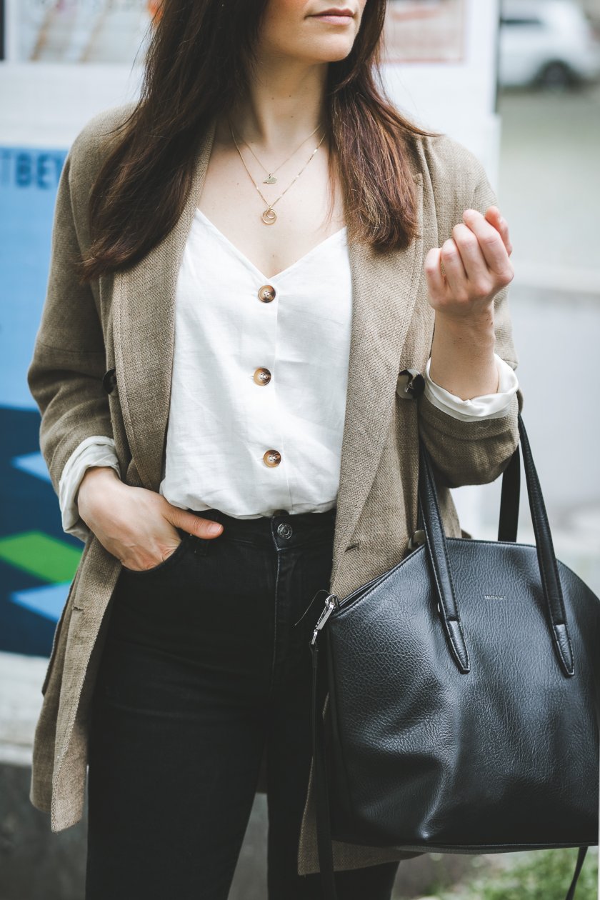 Jede Modesaison hat ihre Lieblinge! In diesem Sommer sind es bei mir auf jeden Fall Teile aus Leinen. Ich liebe das leichte Material, dass vor allem an heißen Sommertagen einen sehr angenehmen Tragekomfort bietet. In meinem heutigen Outfit habe ich gleich zwei Kleidungsstücke aus Leinen integriert und das ist gut so. Zum einen das weiße Top mit großen Holzknöpfen und zum anderen der Blazer, den ihr schon aus diesem Outfit kennt, in einem dezenten Erdton. Diese Teile machen bei mir definitiv Lust auf den Sommer und ich kann es gar nicht erwarten, bis ich mein Leinentop endlich Solo ausführen kann.