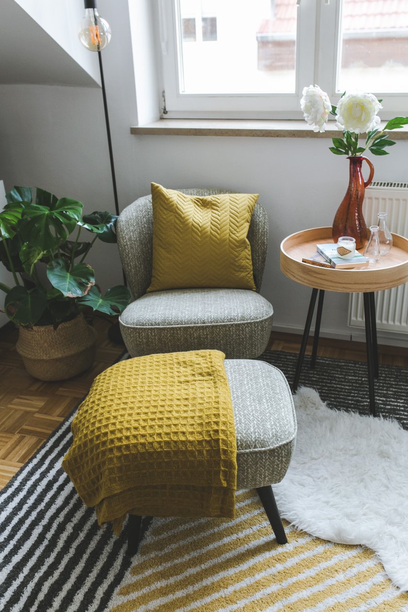 Ich bin eine kleine Frostbeule und friere auch mal gerne im Sommer. Deshalb darf in meiner Leseecke ein gemütliches Plaid natürlich nicht fehlen. Ich habe mich hier für das Modell Zuiver Mimosa entschieden, das in einem auffälligen Senfgelb daher kommt. Senfgelb ist ebenfalls das kleine Kissen, das den Sessel in einen auffälligen Eyecatcher verwandelt. Es kommt ebenfalls in einem Senfgelb daher und hört auf den schönen Namen FEST Amsterdam Anorak.