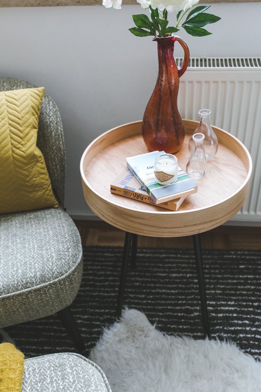 In meiner Leseecke habe ich mich für einen kleinen Beistelltisch Namens Zuiver Oak Tray im Industrialstil entschieden. Das Gute an diesem Tisch: Er kann gleichzeitig als Tablett verwendet werden, denn die Tischplatte ist abnehmbar. So könnt ihr problemlos euren Tee oder Kaffee in eure Leseecke servieren und abstellen.