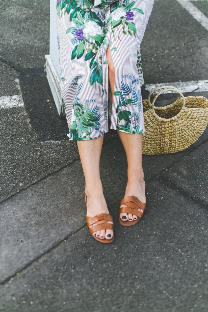Zu dem auffälligen Kleid trage ich braune Mules, die mich sehr stark an die Hémes Oran Sandalen erinnern. Die Sandalen sind einfach super bequem und geben den Füßen jede Menge Freiraum. Am Handgelenk setze ich bei diesem Outfit auf Stroh und trage eine Strohtasche mit runden Henkeln. In diese kleine Tasche passt alles, was ich im Alltag so mit mir herumtragen möchte. Auf der Nase trage ich meine Ray-Ban Aviator Sonnenbrille, die euch bereits aus dem letzten Sommer bekannt sein dürfte.