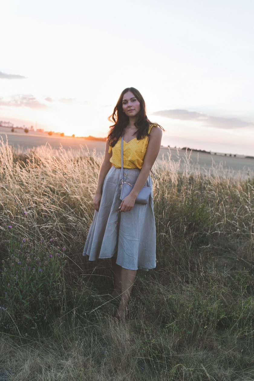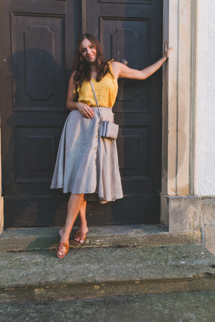 Langsam aber sicher sind wir im Spätsommer angekommen – meiner liebsten Jahreszeit. Mit ihm begebe ich mich auch ganz offiziell in die neue Herbstsaison und verabschiede den Sommer hier auf dem Modeblog. Doch bevor es so weit ist, habe ich noch einen letzten superluftigen Sommerlook für euch, den ich euch nicht vorenthalten möchte. Ich präsentiere euch ein Spätsommer Outfit mit Midirock und gelbem Top hier auf dem Outfitblog.