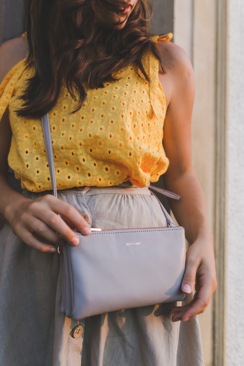 In meinem heutigen Outfit habe ich mich für eine Kombination mit einem gelbem Top entschieden mit auffälligen Lockstickmuster. Ich liebe dieses Muster in den Sommermonaten über alles. Es verleiht den Look den letzten Schliff und macht ihn zu einem eleganten Alltagsoutfit. An den Füßen trage ich wie in diesem Outfit mit Blumenkleid, wieder meine braunen Sandalen – ich liebe sie einfach über alles. Genau so vernarrt wie in die flachen Schuhe, bin ich in meine kleine Tasche von Matt & Nat. Sie ist in letzter Zeit mein ständiger Begleiter und war erst in dem Outfit mit Midirock und Basic Shirt zu sehen.