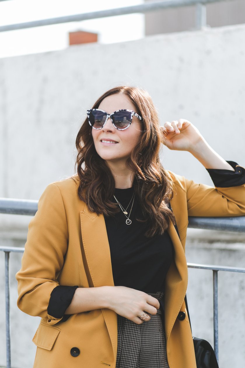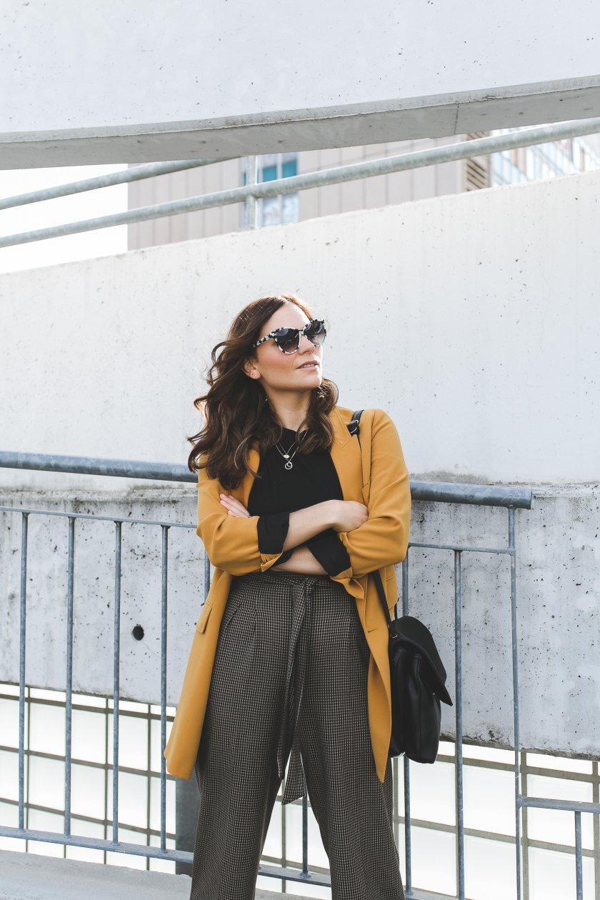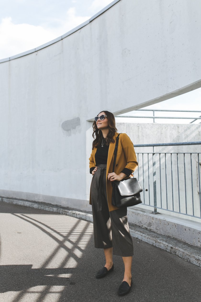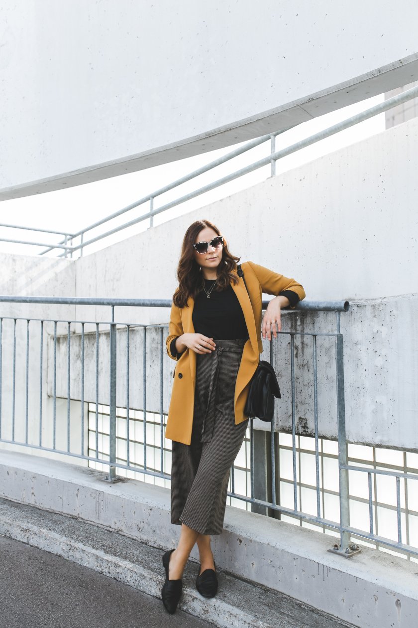 Gelb und Brauntöne sind die Farbklassiker im Herbst. Ich mag diese Farben so gerne und freue mich jede Saison aufs Neue, sie endlich wieder auszuführen. Die warmen Farben spiegeln den Herbst auf eine wunderschöne Weise wieder und verkörpern Wärme und Gemütlichkeit – vor allem an nass-kalten Tagen machen diese Farben gute Laune. Ein Outfit, das genau diesem Farbschema entspricht, habe ich heute für euch gestylt. Ich präsentiere euch eines meiner derzeit liebsten Alltagsstyles mit karierter Culotte, Blazer und Loafers in warmen Farbnuancen hier auf dem Modeblog.