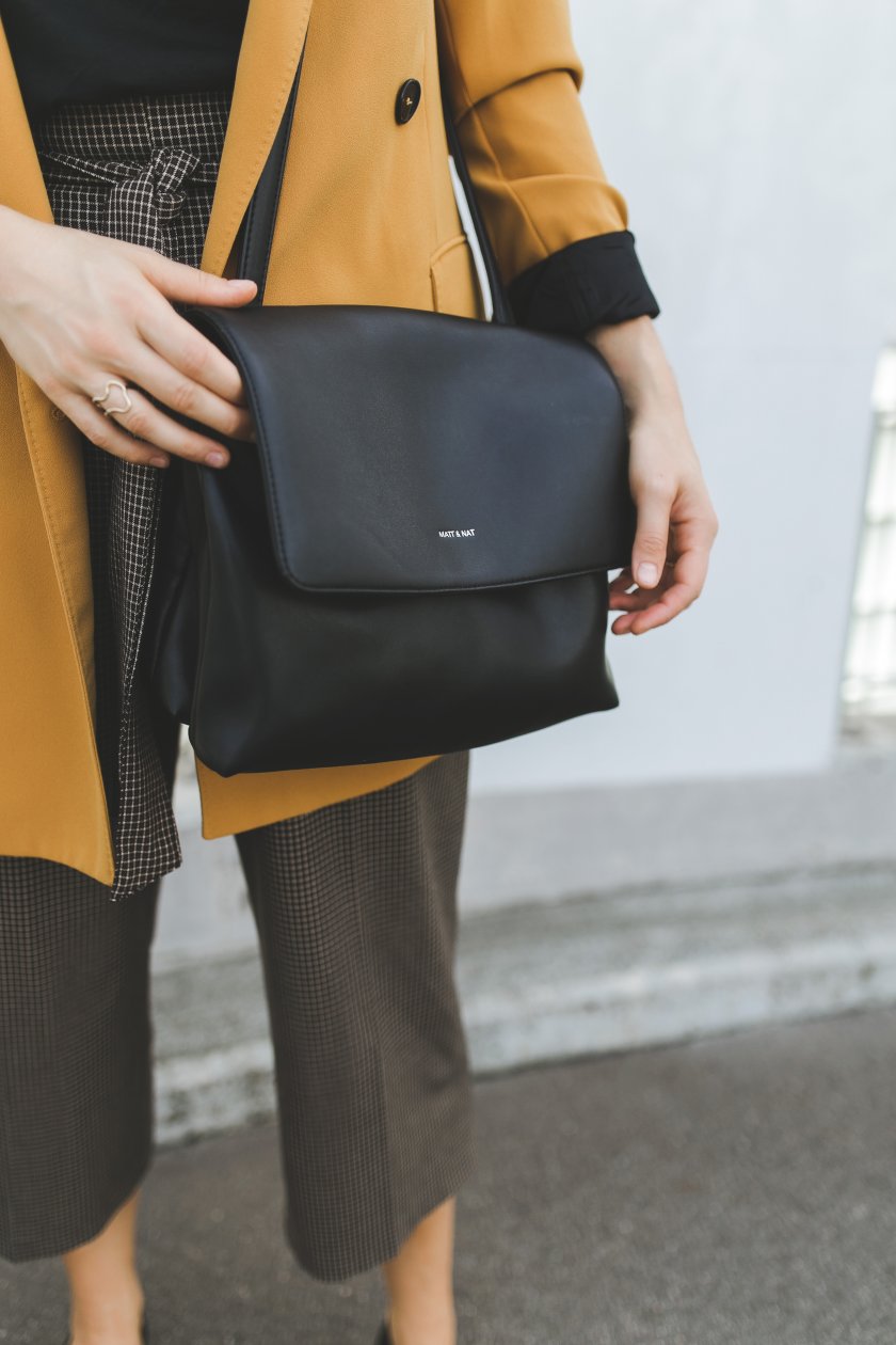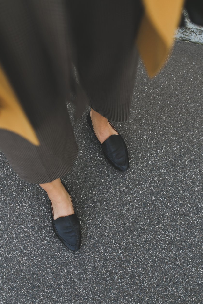 Zu den zwei auffälligen Teilen kombiniere ich drei ganz schlichte Klassiker aus meinem Kleiderschrank. Diese habe ich euch schon in zahlreichen Outfits vorgestellt. Neben dem schwarzen Basic- Shirt trage ich meine geliebte schwarze Tasche von Matt & Nat und meine zeitlosen Loafers von Flattered.