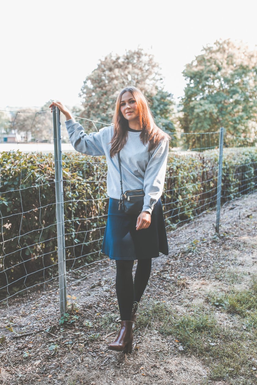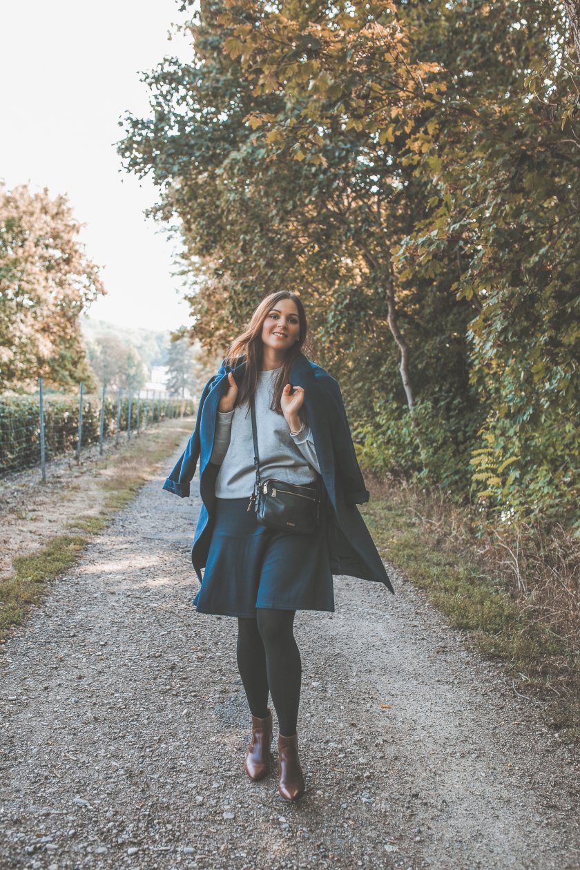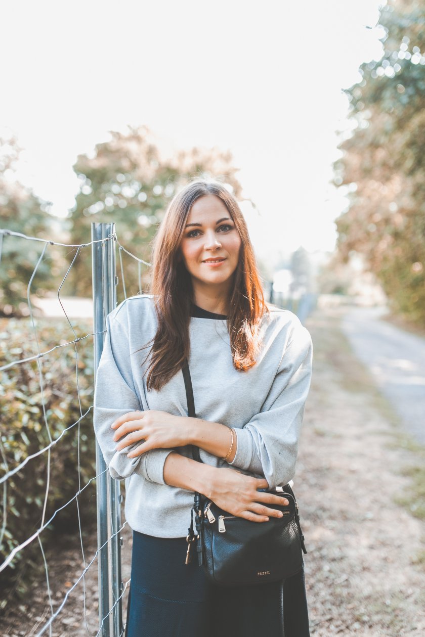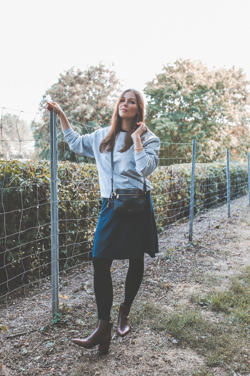 Apropos Pullover, genau mit diesem Herbstklassiker habe ich das Kleid gelayerd. Hierbei habe ich auf dein graues Modell gesetzt, das mit Ballonärmeln ausgestattet ist. Ich liebe diese locker sitzenden Pullover, in denen man sich so gut einkuscheln kann – perfekt um den Herbst gemütlich zu starten.