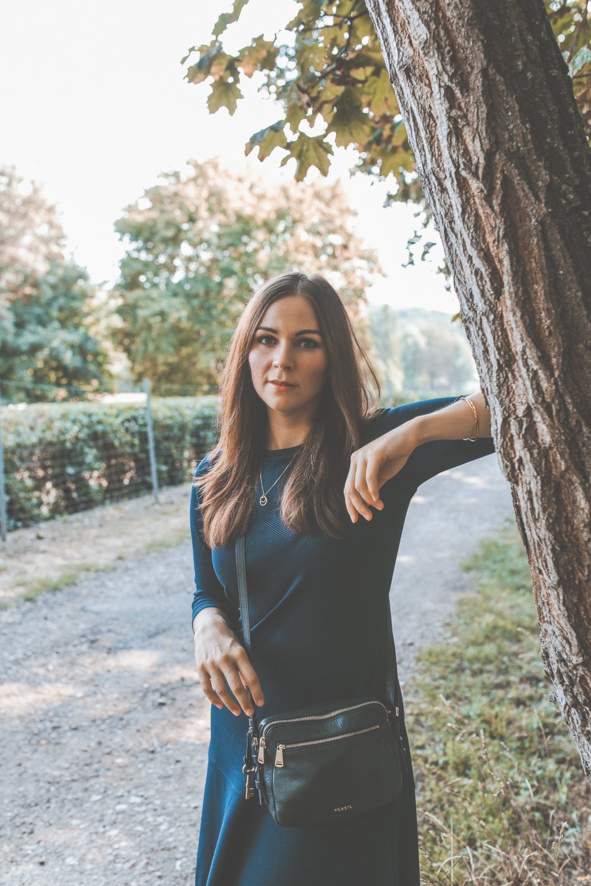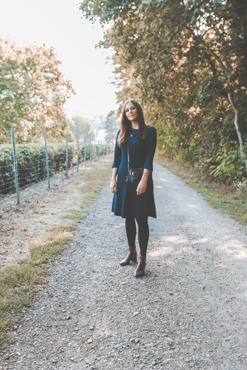 Im Herbst setzte ich auf Lagenlooks, denn sie sind perfekt, um sich an das Wetter anzupassen. Genau so einen Look habe ich heute für euch gestylt und möchte ihn euch jetzt im Detail vorstellen. Die Basis meines Styles bietet das dunkelblaue Jerseykleid mit Volants. Sehr gut an diesem Kleid gefällt mir der A-förmige Schnitt, durch den es sowohl solo als auch in Kombination mit einem Pullover gut getragen werden kann.