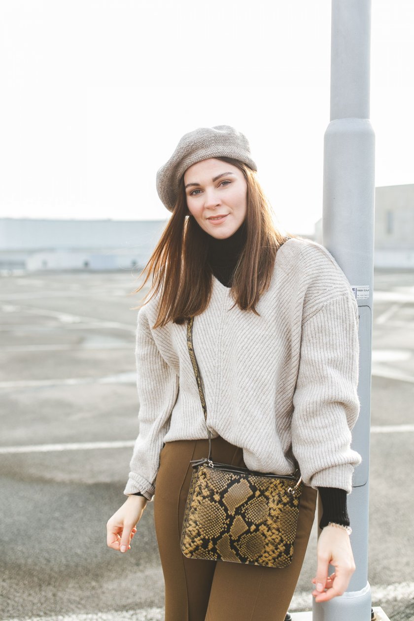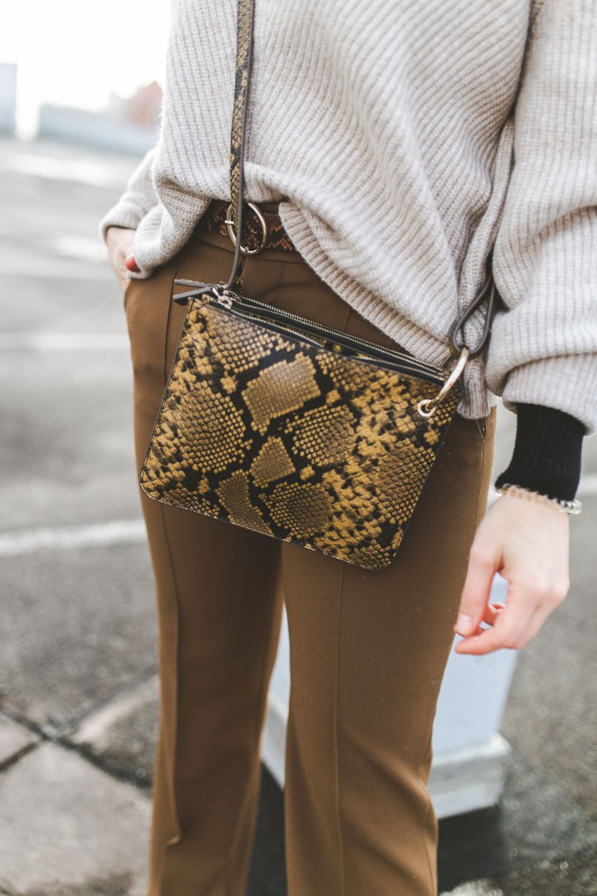 Der Eyecatcher in meinem heutigen Outfit sind definitiv Tasche und Gürtel in einem Animal-Print. Diese verleihen den sonst relativ schlichten Look etwas mehr Pep und lassen ihn interessant wirken. Neben der braunen Bundfaltenhose, in die ich übrigens von Minute eins an verliebt war, steht der Strickpullover in einem weiten Oversize-Schnitt im Mittelpunkt. Ich liebe diese Art von Pullover über alles. Sie halten nicht nur warm, sondern dorngraden elegante Styles auf eine schlichte aber schöne Weise.