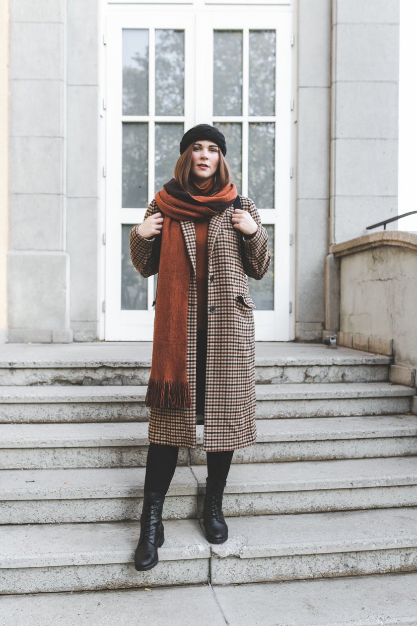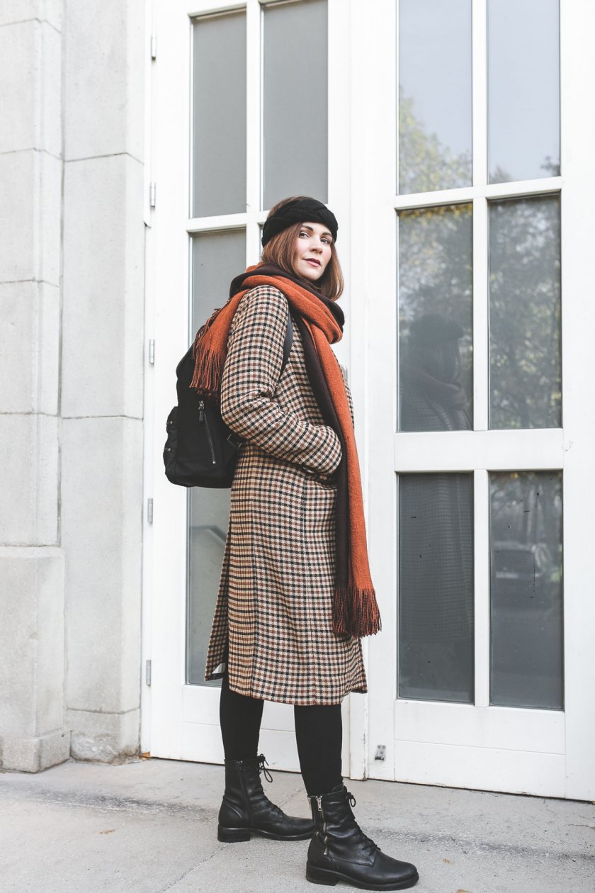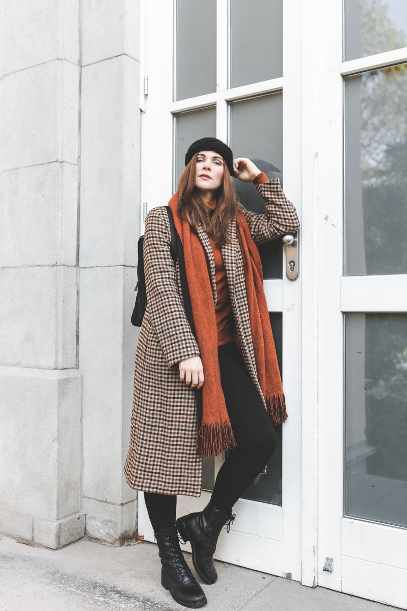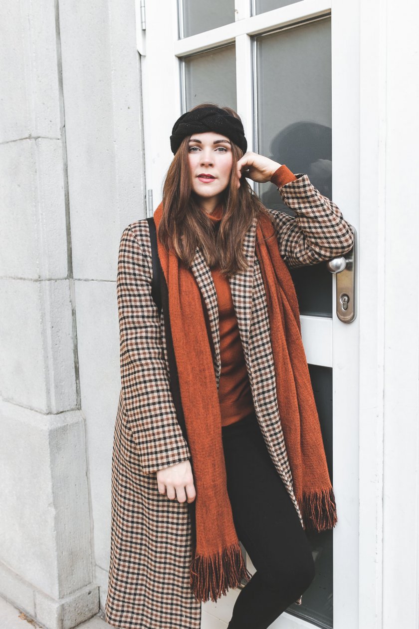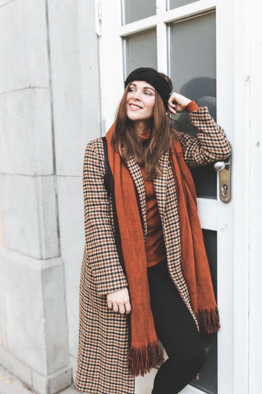 In meinem heutigen Outfit greife ich meine Lieblingsfarben im diesjährigen Herbst/Winter auf. Neben dem klassischen Schwarz gehört diese Saison auch Braun/Camel und Orange zu den Must-have Farben im Kleiderschrank. Das Highlight meines heutigen Looks ist der karierte Mantel, der bereits im letzten Winter bei mir eingezogen ist. Auch das schwarze Stirnband ist ein alter Bekannter aus den letzten Jahren und macht auch diese Saison wieder eine gute Figur auf meinem Kopf.