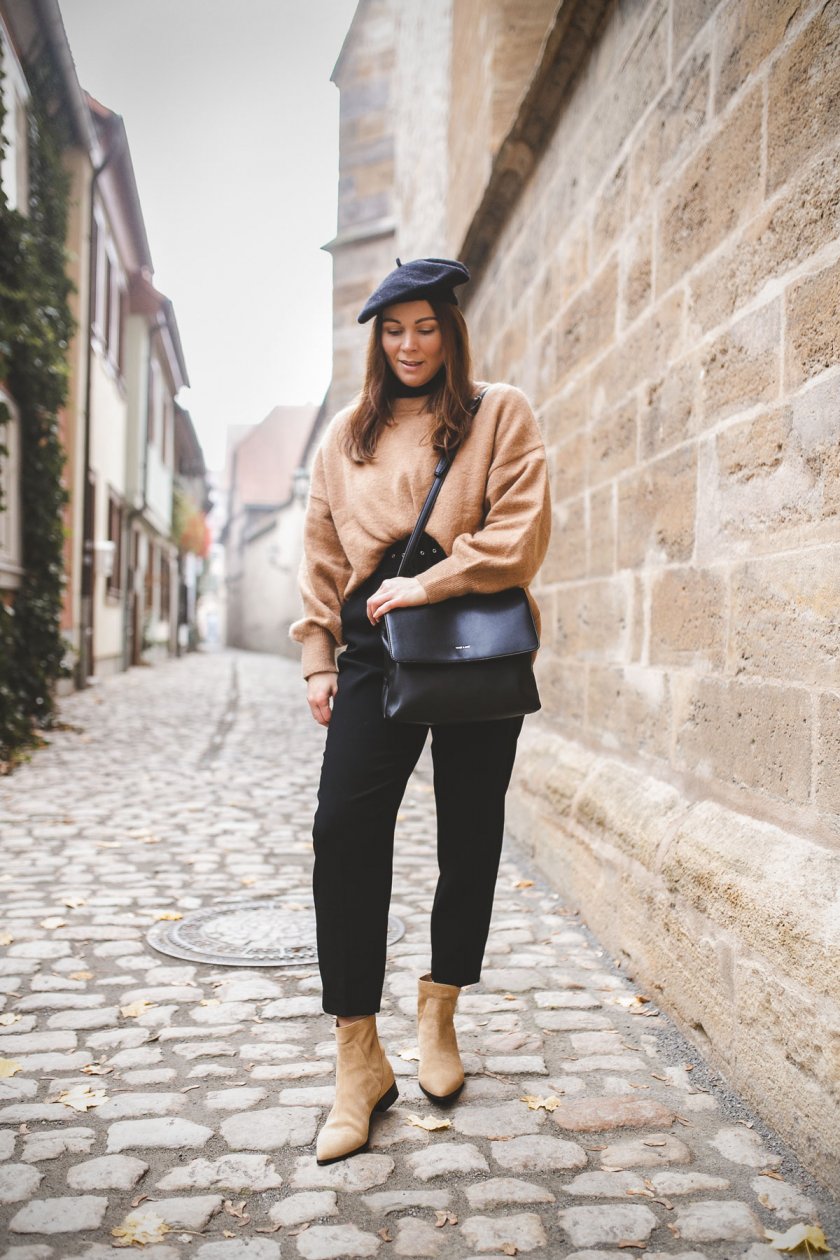 Einer meiner liebsten Teile in diesem Herbst sind schwarze Hosen, wie die Bundfaltenhose, die ich heute in diesem Look gestylt habe. Diese ergänzt sich mit der schwarzen Tasche, die ihr schon sehr oft hier auf dem Outfitblog zu sehen bekommen habt. Das Gute an diesem Klassiker ist, dass er sich perfekt in jede Art von Style integriert. Auch das schwarze Barett ist momentan einer meiner ständigen Begleiter und in diesem Herbst/Winter 2018/19 nicht von meinem Kopf zu denken.