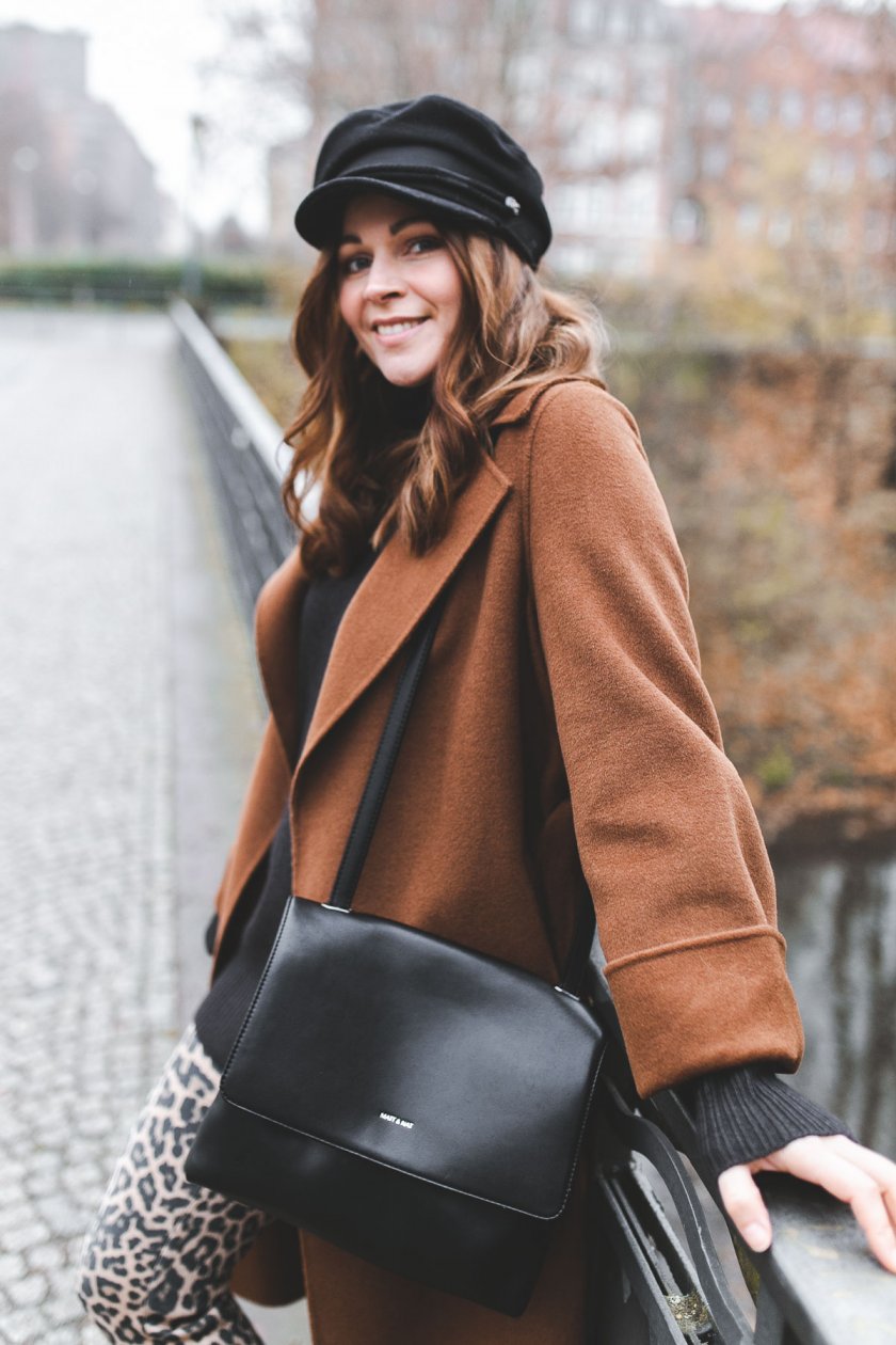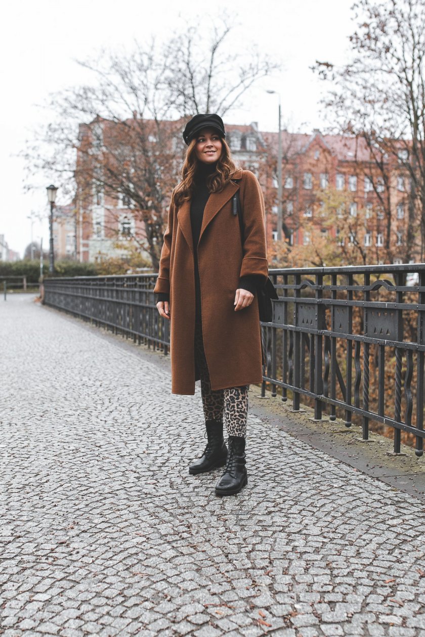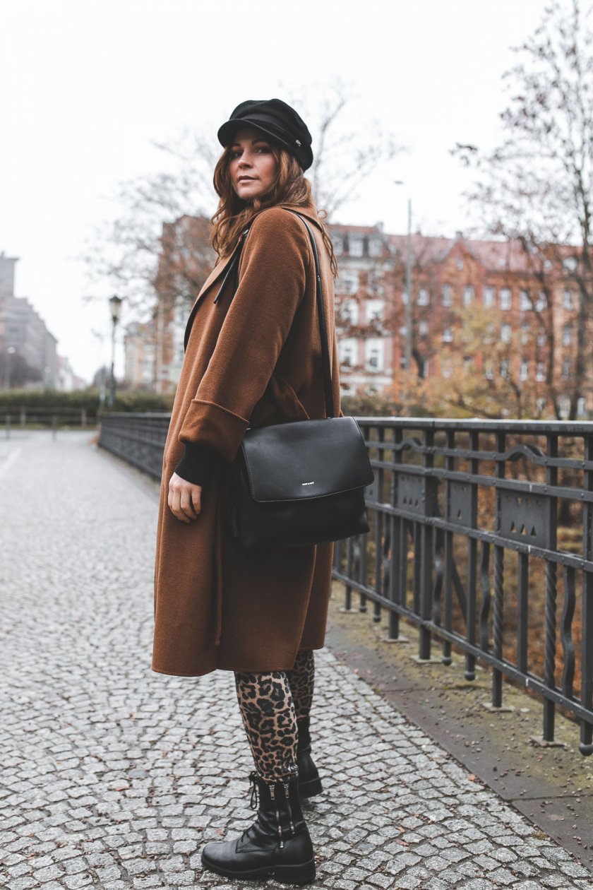 Ganz neu für mich entdeckt habe ich den Animal-Print Modetrend. Dabei bin ich aber auch äußerst wählerisch, was meine Garderobe betrifft. Neben einer Bluse im top aktuellen Leo-Muster, ist jetzt diese Leo Leggings bei mir eingezogen. Diese habe ich zu einem schlichten schwarzen Rollkragenpullover kombiniert sowie lässigen schwarzen Boots. Ich liebe diese Kombination über alles! Und im Zusammenspiel mit meinem braunen Camel Mantel und der schwarzen Baker Boy Mütze, die ihr bereits aus diesem Look kennt, ist das Outfit perfekt um an einem kalten Wintertag das Haus gut gestylt zu verlassen.