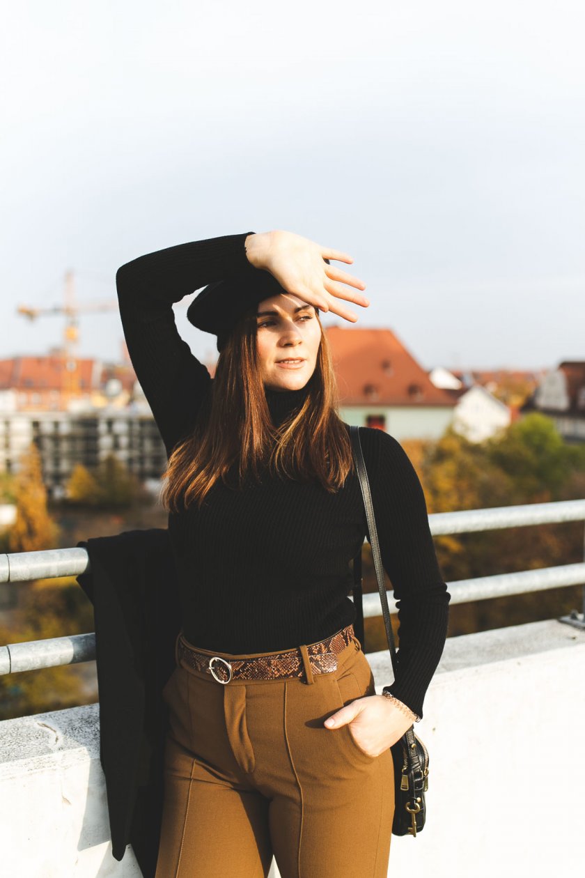 Ein wahrer Klassiker ist der Blazer, den jede Frau in ihrem Kleiderschrank haben sollte. Der Blazer ist ein Allrounder und kann zu jedem Style in Szene gesetzt werden. Und genau deshalb ist er einer der Bestandteile meines heutigen Outfits. Ebenfalls mit dabei ist die Bundfaltenhose, die ich in den letzten Jahren sehr lieb gewonnen habe und ein essenzieller Bestandteil in meinem Kleiderschrank geworden ist. Diese kombiniere ich ganz klassisch zu einem schwarzen Rollkragenpullover – ein Style, der in jedem Winter besticht. Die Bundfaltenhose wähle ich in der top aktuellen Trendfarbe: Camel. Ich liebe diese Farbe abgöttisch und könnte sie derzeit 24/7 tragen.