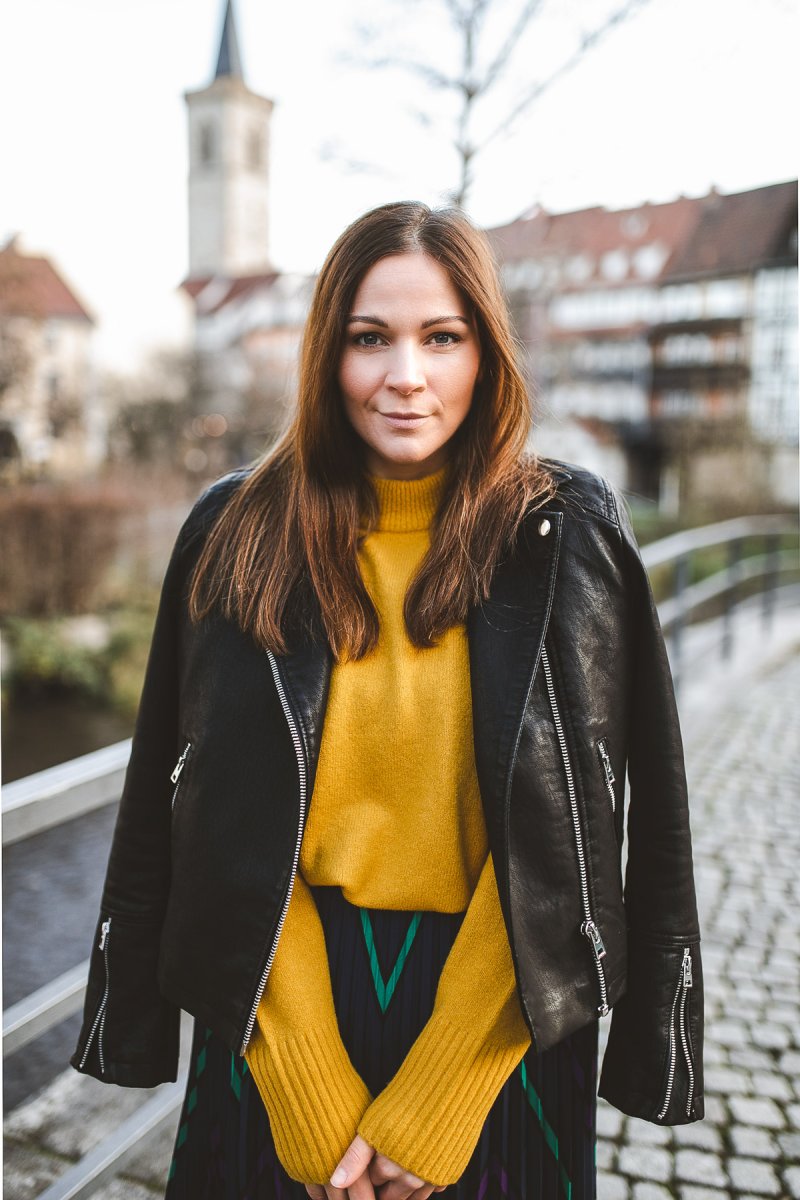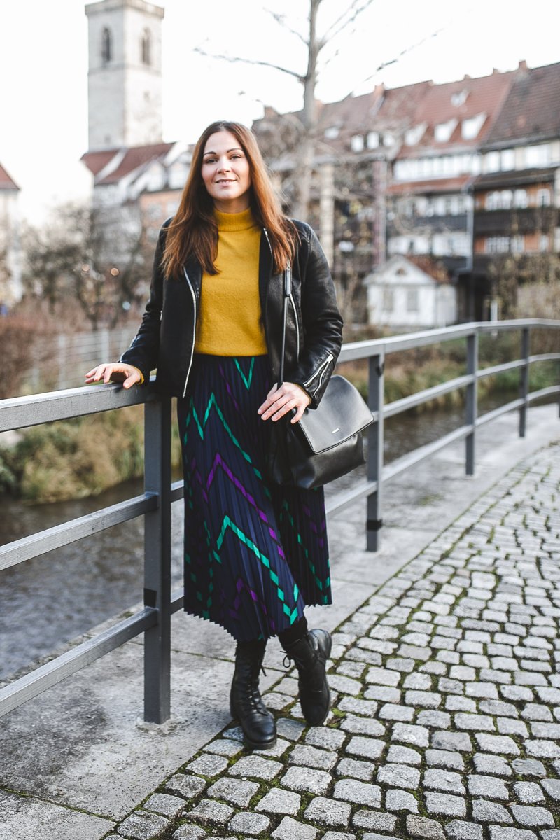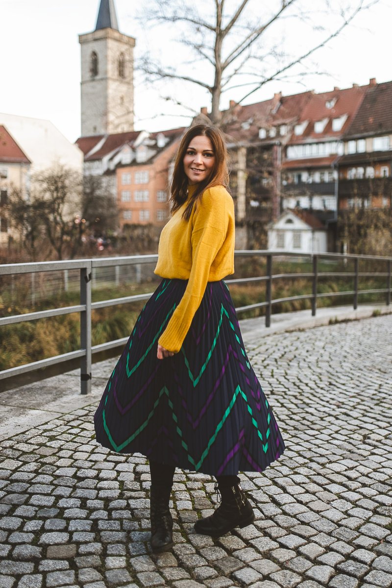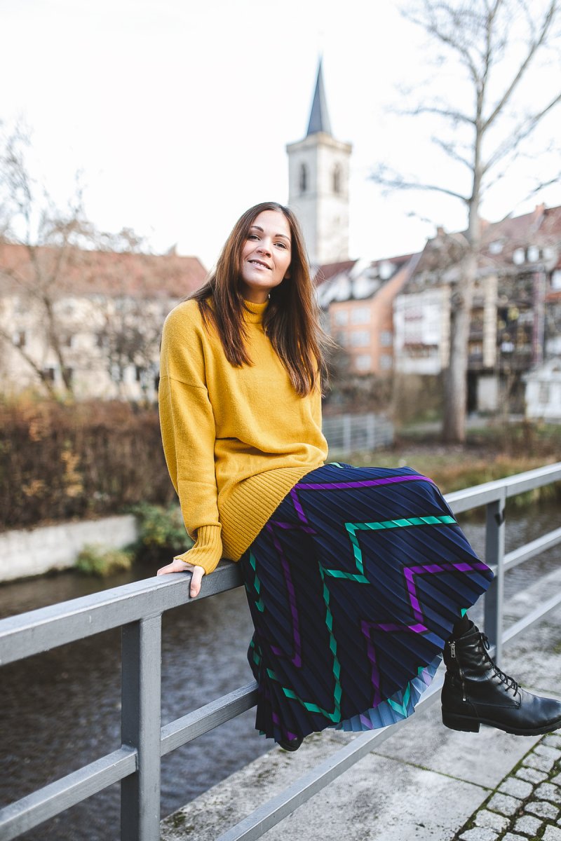 Der Pullover ist superwarm und schmiegt sich dank des Stehkragens perfekt an meinem Hals an. Und die knallige Farbe macht sogar an grauen Wintertagen gute Laune. Zu dem auffälligen Strickpullover habe ich einen Midi-Rock in Faltenoptik kombiniert. Der Rock ist die perfekte Ergänzung zu dem auffälligen Pulli und komplettiert ihn auf eine schöne Weise. Besonders gut an dem Rock gefällt mir, dass dezente geometrische Muster. Dieses passt farblich sehr gut zum gelben Pullover.