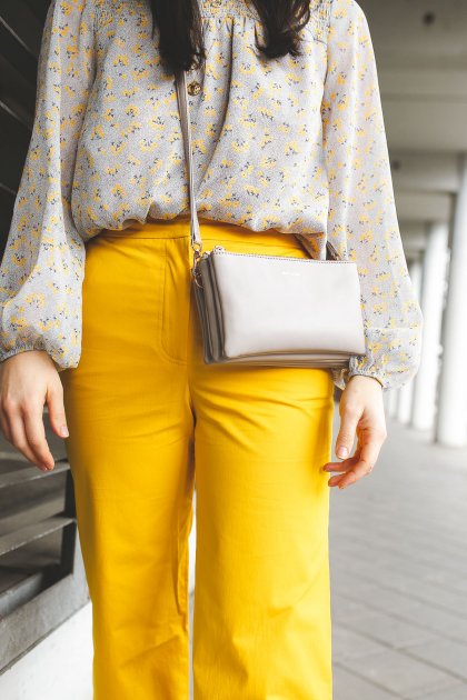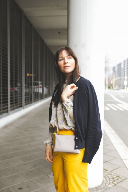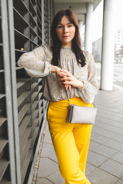 Zu der sehr auffälligen Hose setzte ich bei dem Oberteil eher auf Zurückhaltung. Ich habe eine Bluse mit zartem Blumenmuster gewählt und die gelbe Farbe wird in diesem Muster dezent aufgegriffen. Dieses Oberteil besticht nicht nur durch ihren tollen Schnitt, sondern auch durch das dezente Frühlingsmuster.