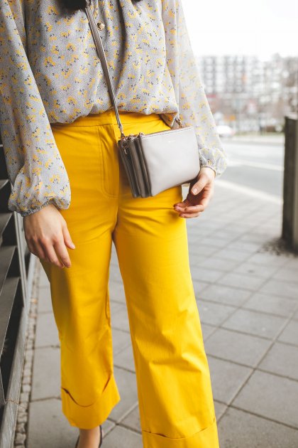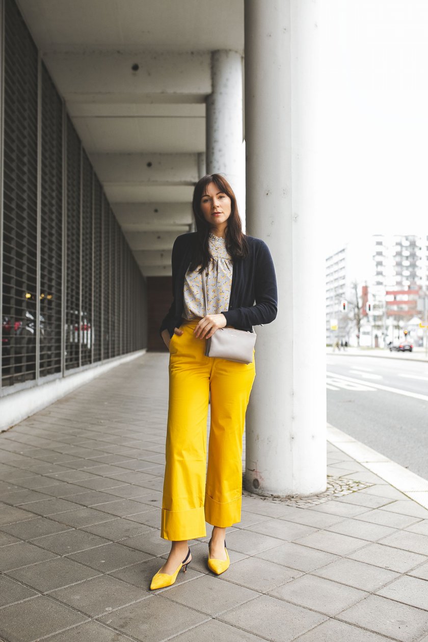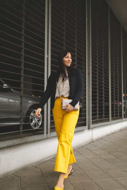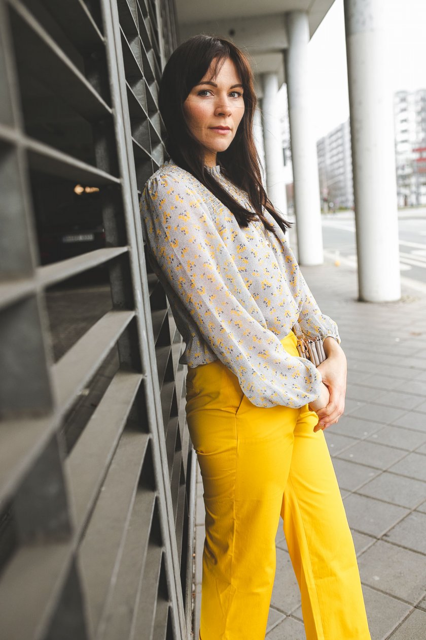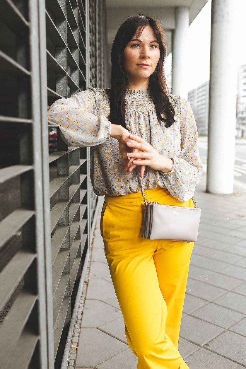 Frühlingsoutfit mit gelber Hose und Blumenprint-Bluse: Modetrend Frühjahr/Sommer 2019 zum Nachshoppen!