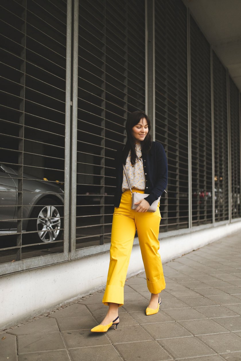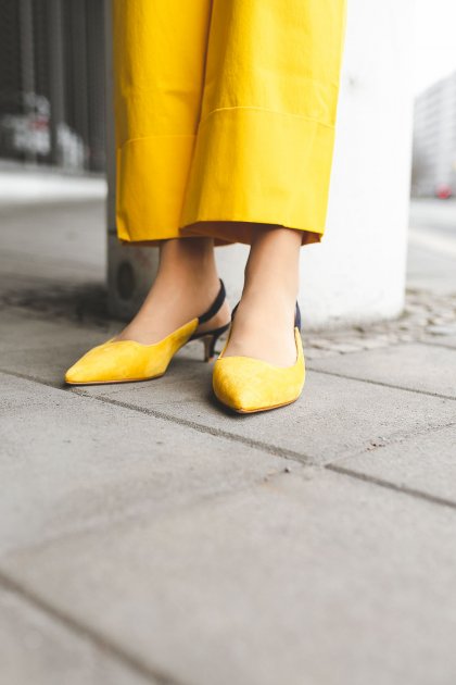 An den Füßen geht es auffällig weiter mit den zweifarbigen Pumps in Gelb und Blau. Ich liebe diese Art von Schuhen, denn sie sehen elegant aus ohne unbequem zu sein! Wie ihr wisst, ist mir das im Alltag superwichtig.
