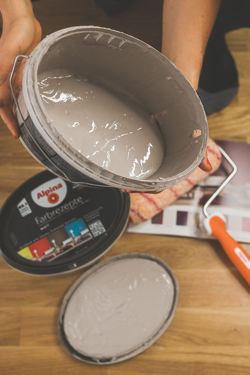 Ist alles abgeklebt und der Boden geschützt, kann es auch schon losgehen. Öffne die Farbe und rühre diese einmal gut auf. Gebe eine gewisse Menge der Farbe in die Farbwanne und beginne die Farbe auf die Wand aufzutragen.