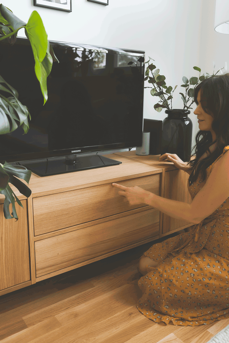 Der erste Neuzuwachs, den ich dir jetzt vorstellen möchte, ist das GRYD Lowboard von MYCS. Dieses habe ich ganz in Eiche und mit Schubladen und Türen geschlossen gestaltet. Stauraum ist einfach alles und ich mag es in meinen vier Wänden gerne clean und ordentlich.