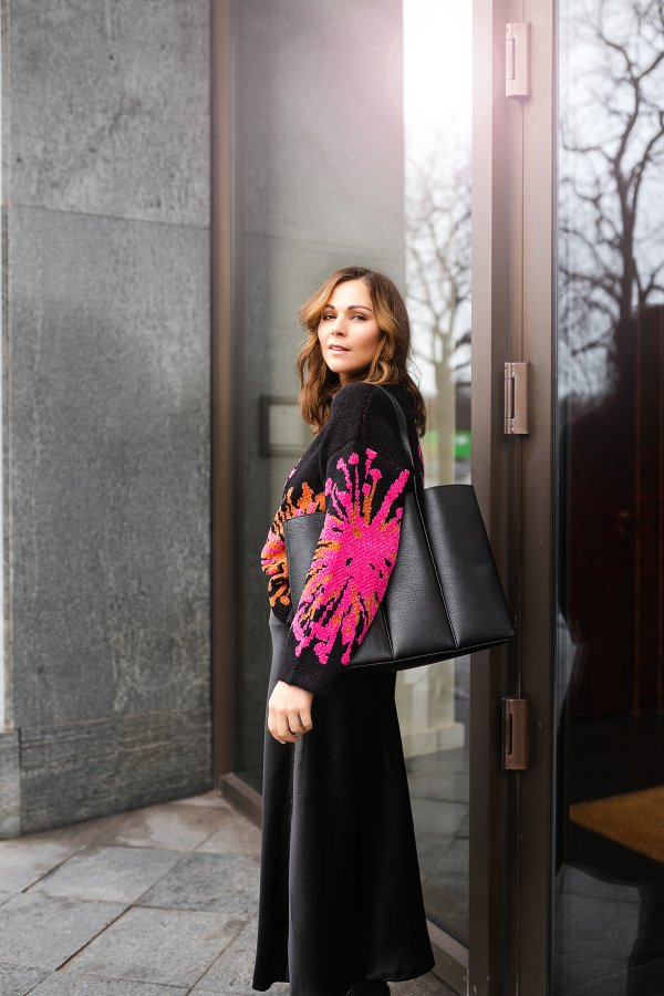 In meinem heutigen Winter Outfit kombiniere ich den eleganten Midirock zu einem auffälligen Strickpullover. Ich bin ein großer Fan vom Mixen unterschiedlicher Materialien und dieser Look bietet dafür sehr viel Spielraum. Abgerundet wird der Style mit einem gemütlichen schwarzen Mantel, der das Rock Outfit gleichzeitig winterfest macht. Wieder mit dabei sind meine schwarzen Boots sowie die neue schwarze Tasche von Matt & Nat, die auf den Namen HYDE getauft wurde. Beides sind zeitlose Basics, die sich im Alltag zu jedem Style austragen lassen.