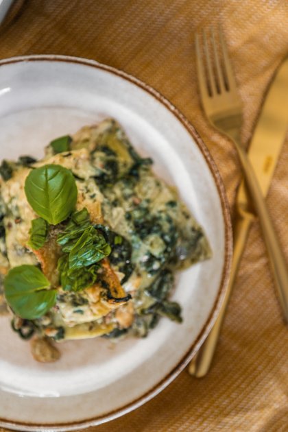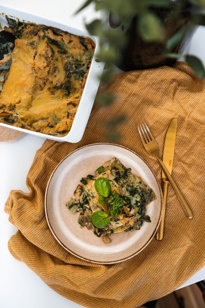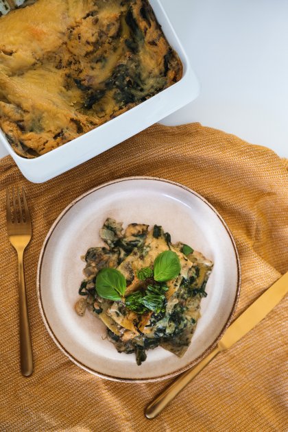 Zubereitung der veganen Mangold-Spinat-Lasagne mit Lasagneplatten aus grünen Linsen