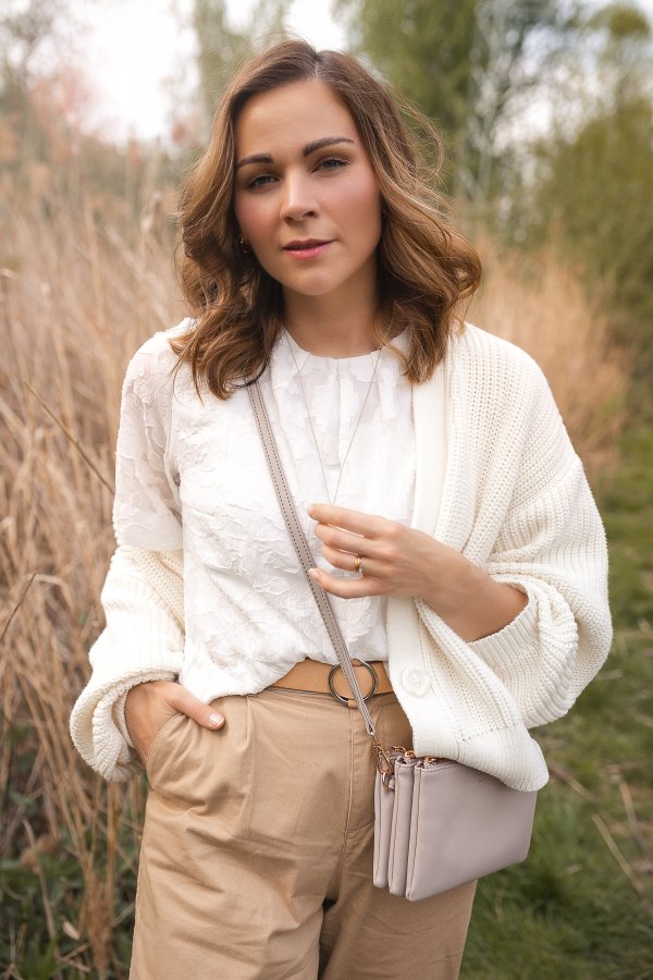 In meinem heutigen Outfit habe ich mich für einen Mix aus lässig und chic entschieden. Zu der leichten Stoffhose trage ich eine elegante weiße Bluse und Cardigan aus. Je nach Temperatur kann ich den Style anpassen und ihn mit oder ohne Cardigan ausführen. Über die Schultern habe ich mir meine geliebte Matt & Nat Tasche geworfen, die mich schon einige Jahre begleitet und den Look sehr gut ergänzt.