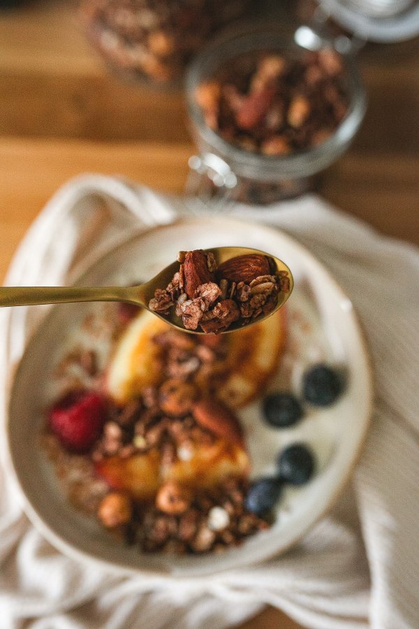 Granola ist in aller Munde! Doch was steckt hinter diesem magischen Wort, das sich alle wie wild auf ihre Frühstücksgerichte streuen? Ich würde Granola als eine Mischung aus Müsli und Crunch bezeichen. Es besteht zu 90 % aus Nüssen und ist somit supergesund. Ein weiterer Vorteil, den das selbst gemachte Granola bietet, es kann nach eurem Geschmack gesüßt werden. Außerdem ist es viel billiger, als die gekaufte Version. Also wenn das nicht gleich zwei schlagfertige Argumente sind, sich mal wieder in die Küche zu stellen und das Granola-Topping einfach schnell selbst zu machen. Findet ihr nicht auch?!