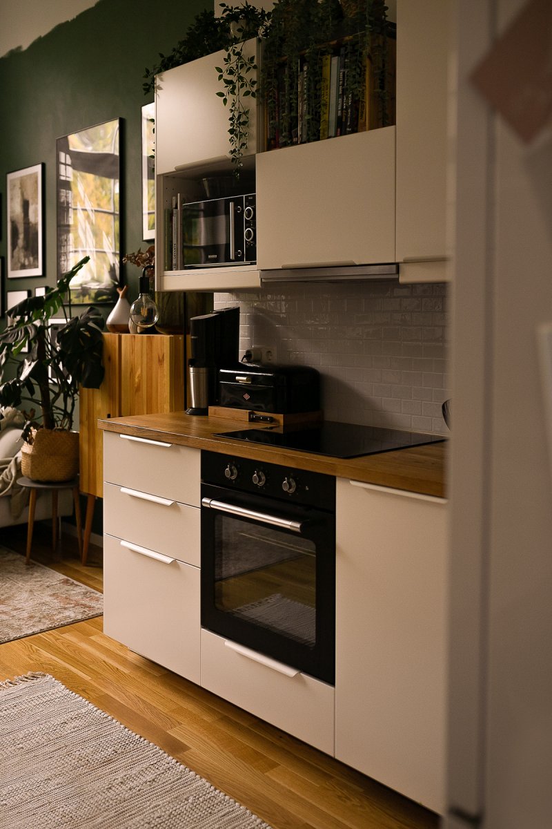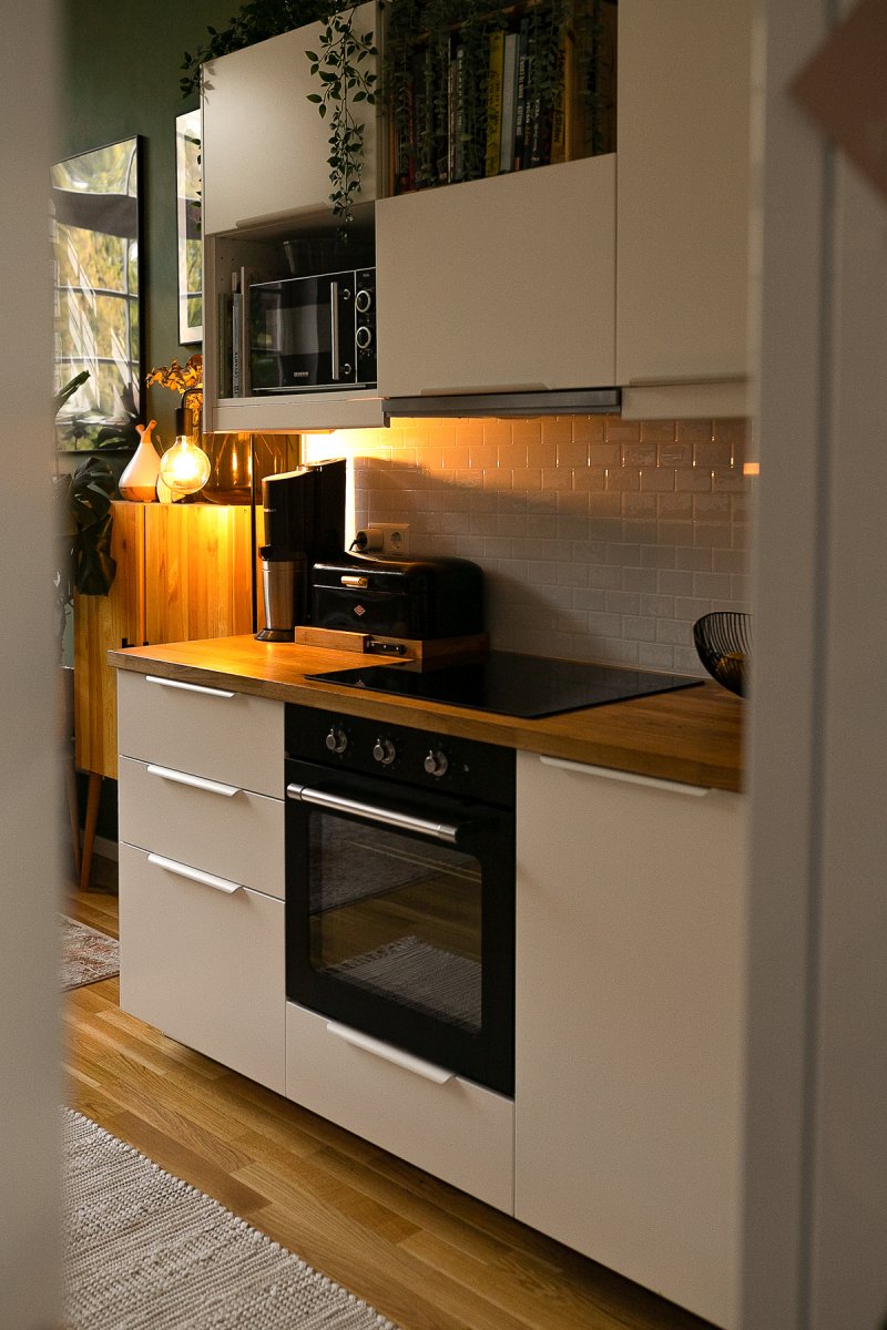 Bei meiner Wohnküche habe ich auf ein helles und warmes Farbkonzept gesetzt. Ich habe mich für weiße, cleane Fronten entschieden und bei der Arbeitsplatte für einen warmen Holzton. Mit der Arbeitsplatte aus Holz greife ich die warme Atmosphäre des Raumes wieder auf – was meinen Wohnbereich unglaublich gemütlich macht. Für zusätzliche Gemütlichkeit sorge ich mit kleinen Accessoires, die ich euch gleich im Detail vorstelle. Da meine Küche keinen Fliesenspiegel hatte, habe ich mich für eine Klebefolie in trendiger Fliesenoptik entschieden. Die beste Entscheidung ever! Dieser wertet meine Küche einfach super auf und verleiht ihr einen modernen-retro Charme.