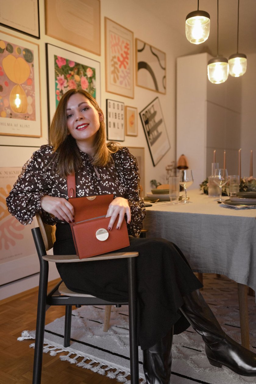 Schwarzer Rock | gemusterte Bluse | orange Tasche | schwarze Stiefel