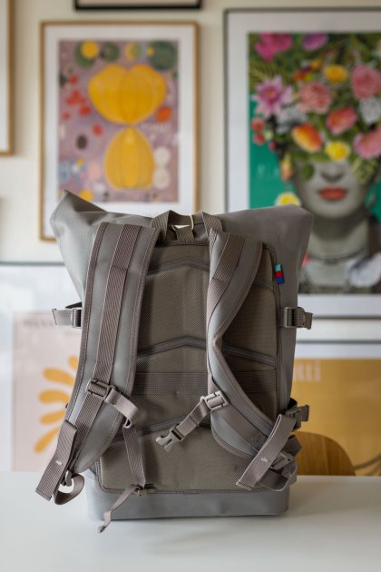 Fitz & Huxley hingegen fahren ein anderes Konzept, das weniger aufwendig ist und ressourcenschonender arbeitet. Sie verwenden das sogenannte Ocean Bound Prinzip und sammeln Plastikmüll an Flüssen und Stränden ein. Dies hat den Vorteil, dass das Plastik leichter verarbeitet werden kann, weil es weniger angegriffen ist. Ein aufwendiger Reinigungsprozess entfällt. Löblich ist noch zu erwähnen, dass 90 % des Rolltops aus recycelten Plastik bestehen. Ausgenommen sind auch hier Reißverschluss, Mesh und Rückenpolster.