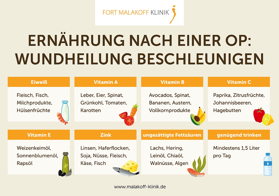 Wusstet ihr, dass die Ernährung einen wichtigen Teil zur Wundheilung beiträgt? Tatsächlich ist es gerade in der Heilungsphase, in der der Körper viele verschiedene Nährstoffe benötigt, wichtig, dass ihr euch ausgewogen ernährt. So stellt ihr eurem Körper alle nötigen Vitamine, Mineralstoffe & Co. zur Verfügung. Für die Wundheilung sind insbesondere die Vitamine A, B, C und E wichtig, aber auch Zink, Omega-3-Fettsäuren und Eiweiß braucht euer Körper dafür.