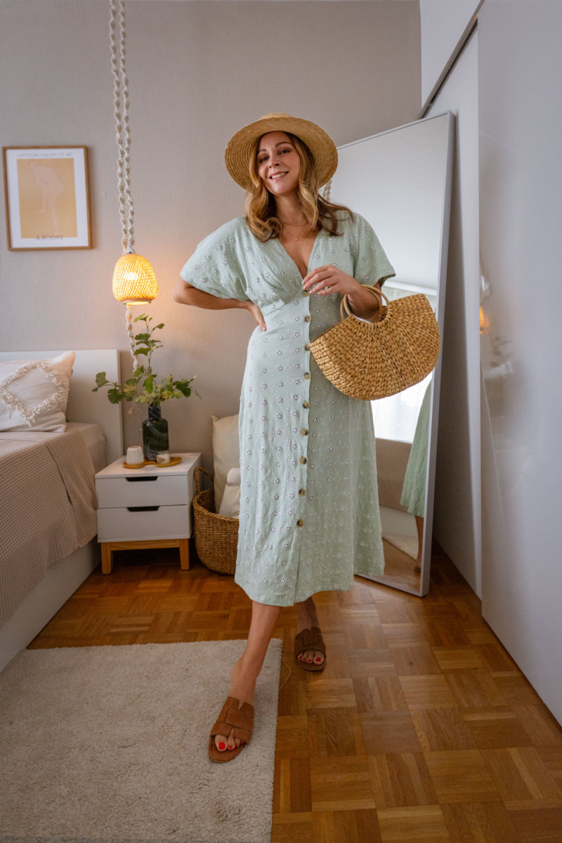 Das 4. Outfit schreit förmlich nach den letzten warmen Sommertagen. Dieses zuckersüße Maxikleid mit den verspielten Lochstickereien ist wie geschaffen für den Alltag oder Urlaub. Mit einem Strohhut auf dem Kopf macht es definitiv auch an der Strandpromenade eine gute Figur. Abgerundet wird der Look mit meinem geliebten Strohkorb und flachen Sandalen.